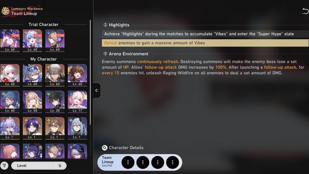 各試合では、3つのトライアルキャラクターが提供されます。これは、チャレンジごとに異なります。また、自分のキャラクターの1つに4番目のオープンスロットを取得します。このスロットでヒーラーを選択することは、ほとんどの状況を処理するのに十分なトライアルキャラクターが一般的に強いため、うまく機能します。