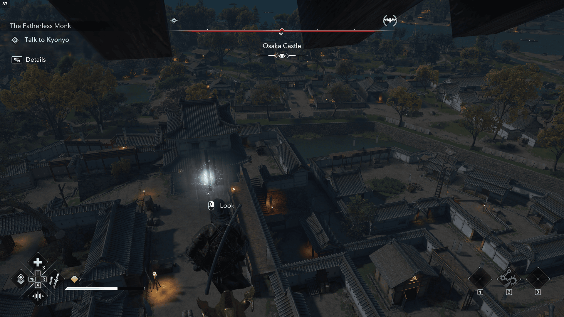 Eagle Visionを効果的に使用するには、その上に速い移動ポイントがある背の高い大阪城の建物に登りたいと思います。高速移動ポイントのロックを解除してから、数階に飛び降りて、要塞全体のより良い眺めを得ます。ここから、イーグルビジョンを使用して、表示されている赤い外観の敵をマークします。イーグルビジョンを使用して敵をマークするために、城の周囲に沿って移動し続けます。城の外側を歩き回っている敵がいるので、メインの城エリアの内外の両方を見るようにしてください。