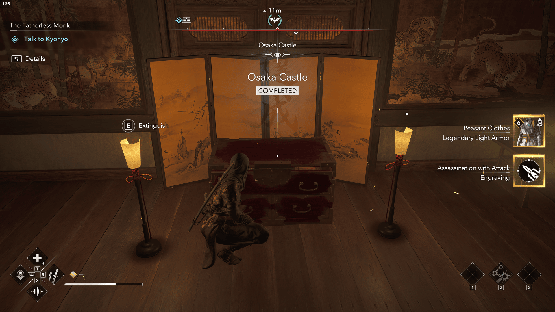 大阪城での胸の報酬は、農民の服の伝説的な光の鎧と攻撃の彫刻による暗殺です。ただし、大阪城の周りにある小さな胸やリソーススタッシュを略奪し、メイン城の下階に略奪することで、多くの小さな報酬を獲得することもできます。