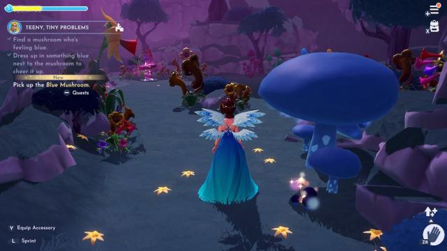 森の入り口の近くでは、かなり悲しい青いキノコを見つけます。スピリットを持ち上げるには、青いもの(帽子、靴、何人でもカウント!)をつけて、そのそばに立ってください。小さい青いキノコあなたが収集するためにポップアップします。