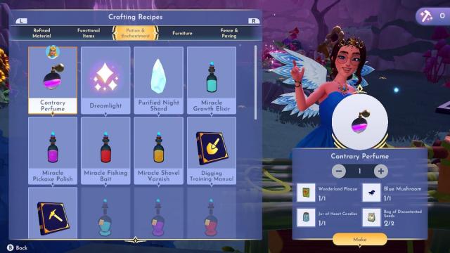 すべての材料を手にして、ワンダーランドの領域の入り口の近くに作られたベンチを見つけます。すべてを組み合わせて作成します反対の香水。右上のクリアリングにある弾力のあるキノコを介してアリスに戻り、彼女が成長するのを助けるためにそれを引き渡します。成功!