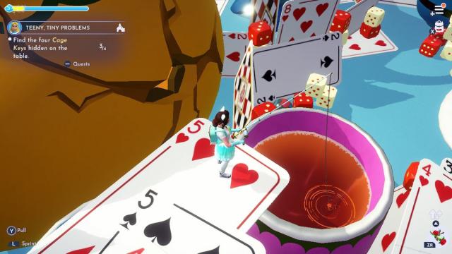 - キー2:このキーを見つけるために、水をまく缶で砂糖キューブの山を溶かします。 2つのティーカップの間の狭いカードパスを取り、登り、キーをつかみます。