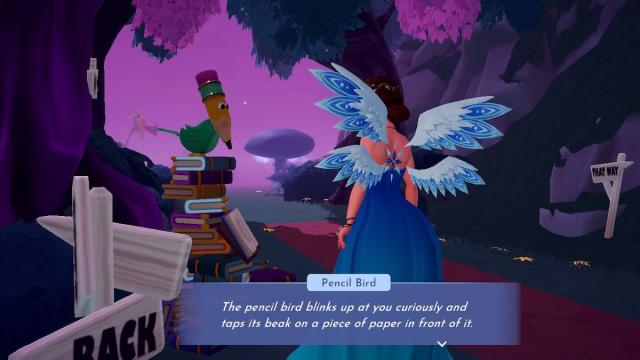 キノコのすぐそばを越えて、鉛筆の鳥に会います。彼は本の山に座っていて、あなたは不思議の国の立ちとこのクエストの間で彼を何度か通り過ぎました。