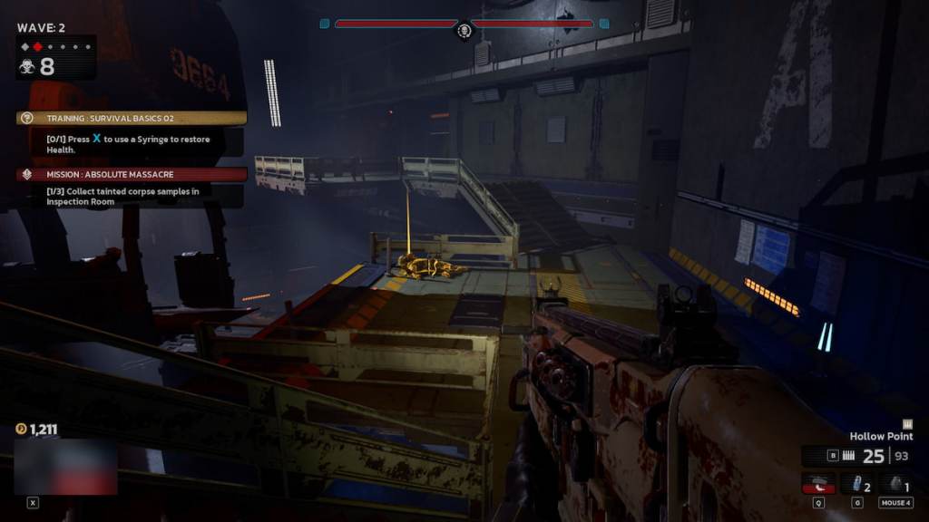 最後の汚染された死体のサンプルは上にあります。階段の最初のセットを登り、ぶら下がっている容器にジャンプするか、その周りに長い道のりを進みます。最終的な死体のサンプルは、容器のふもとにあり、その上にAが塗られた壁にあります。