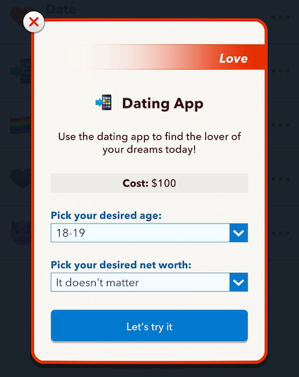 あなたより10歳以上の人と接続するには、少なくとも28年以上のキャラクターを老化させ、アカウントにいくらかのお金を持っている必要があります。その年齢に達したら、活動そして愛デートアプリを見つけるオプション。必ずしも希望する年齢として18-19を選択しますその人とデートするために。