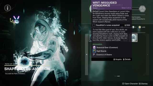 - 令状:見当違いの復ge:ソーラーまたはアークのダメージを使用してルーセントハイブを倒して、魔女の女王のルーンを主張します。システム内のどこでもハイブを倒すと、魔女のクイーンズルーンの痕跡が得られることがあります。ルーンを収集した後、システム内のどこでもエリートハイブを倒します。地球上のハイブを獲得するボーナスの進捗状況。