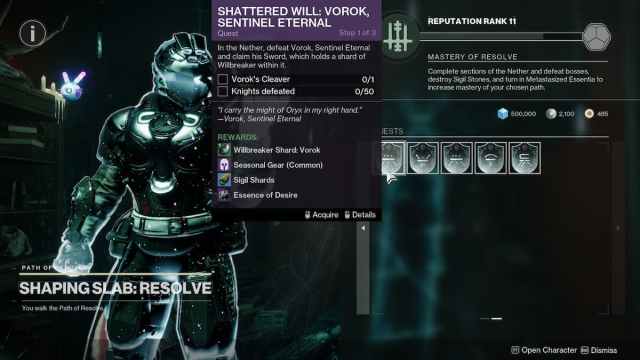 - 粉砕されたウィル:Vorok、Sentinel Eternal:ネザーでVorokを見つけて倒します。 Dreadnaughtの各エリアでランタンを使用してVorokを召喚できます。 Vorokを倒した後、システム内のどこでも剣を使用してターゲットを殺します。
