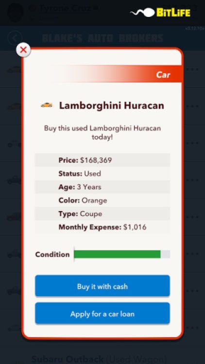 3つのディーラーがランボを持っていない場合は、リストをリフレッシュするために年を1年上げたり、手動でBitLifeを閉じたりします。ランボスはやや珍しいので、そうかもしれません1つが表示される前に、いくつかのリフレッシュを取ります。