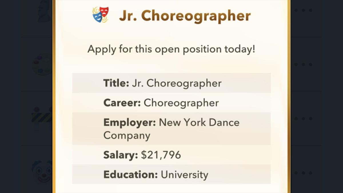 大学を卒業したら、あなたが見るまでフルタイムのジョブリストを検索してくださいJr.振付師。前と同じように、このオプションがすぐに表示されない場合は、アプリを閉じて再開する必要がある場合があります。大学の学位を取得しているため、ポジションを申請し、インタビューに合格して仕事に就き、この最終タスクを終了する必要があります。