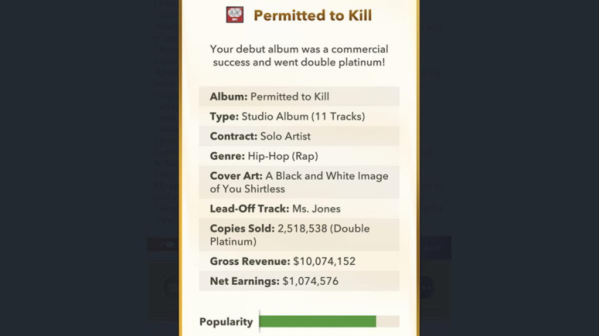 BitLife'sの違いの5番目のタスクは、米国の課題とは異なり、最も困難です。あなたの目標は、少なくとも3つのレコード(シングルまたはアルバム)がプラチナを持っていることです。この目標はほぼ完全にランダムであり、ジャンル、カバーアート、ランダムなイベント応答などの要因が成功にわずかに貢献しています。