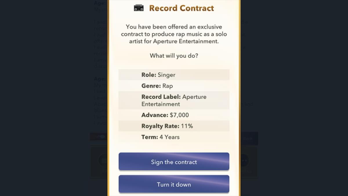オーディションで成功した場合、音楽を制作するための独占契約が提供されたことを示すポップアップを受け取ります。ジャンルが音楽をラップしていない場合は、それを下げて、ラップシンガー契約になるまでオーディションを続けてください。これを受け入れてラッパーになります。