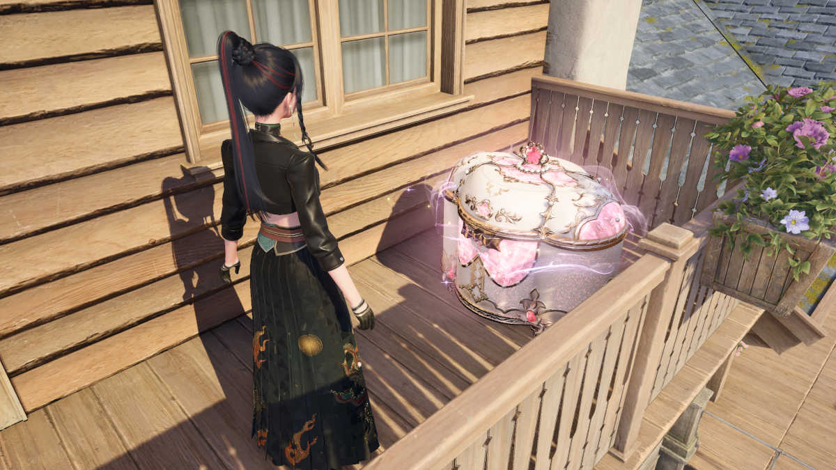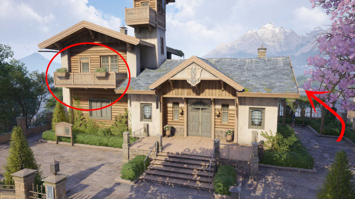 キングダムガードのオフィスの外に立っているときは、そこにバルコニーを見つけるために右に見上げてください。胸はこのバルコニーにあるので、屋根の上に立ち上がってアクセスする必要があります。これを行う最も簡単な方法は、建物の右側のトレリスにジャンプし、屋根に上がり、バルコニーに上って胸を開けることです。