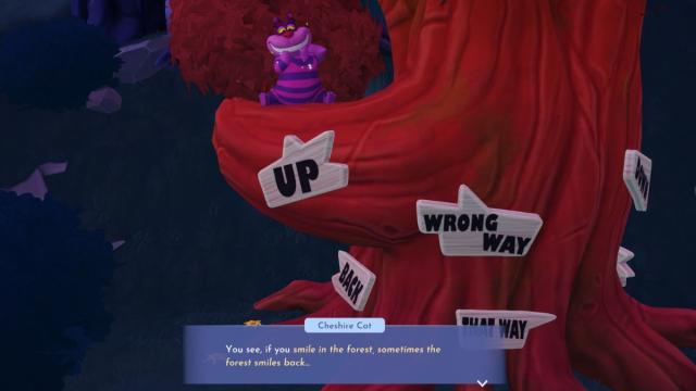 あなたは今見つける必要がありますチェシャーの笑顔の3人森で。最初のものは彼の木の右への道を下っています。