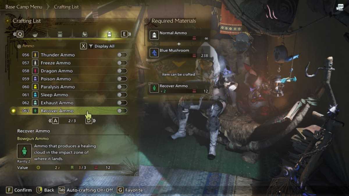 回復弾薬が展開します癒しの霧の緑の雲それが表面に当たったとき、あなたとあなたの同盟国を許可します健康を回復します彼らがそれに残っている限り。これは、より困難な狩り中に一定の癒しの源でチームをサポートするための有用な弾薬タイプです。