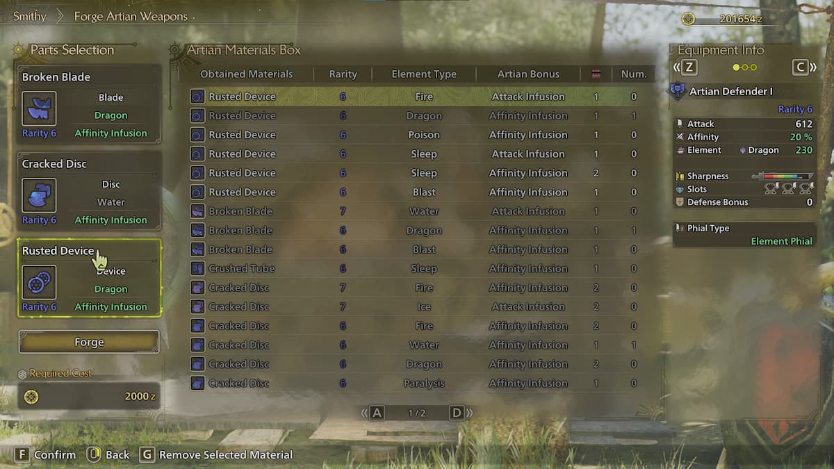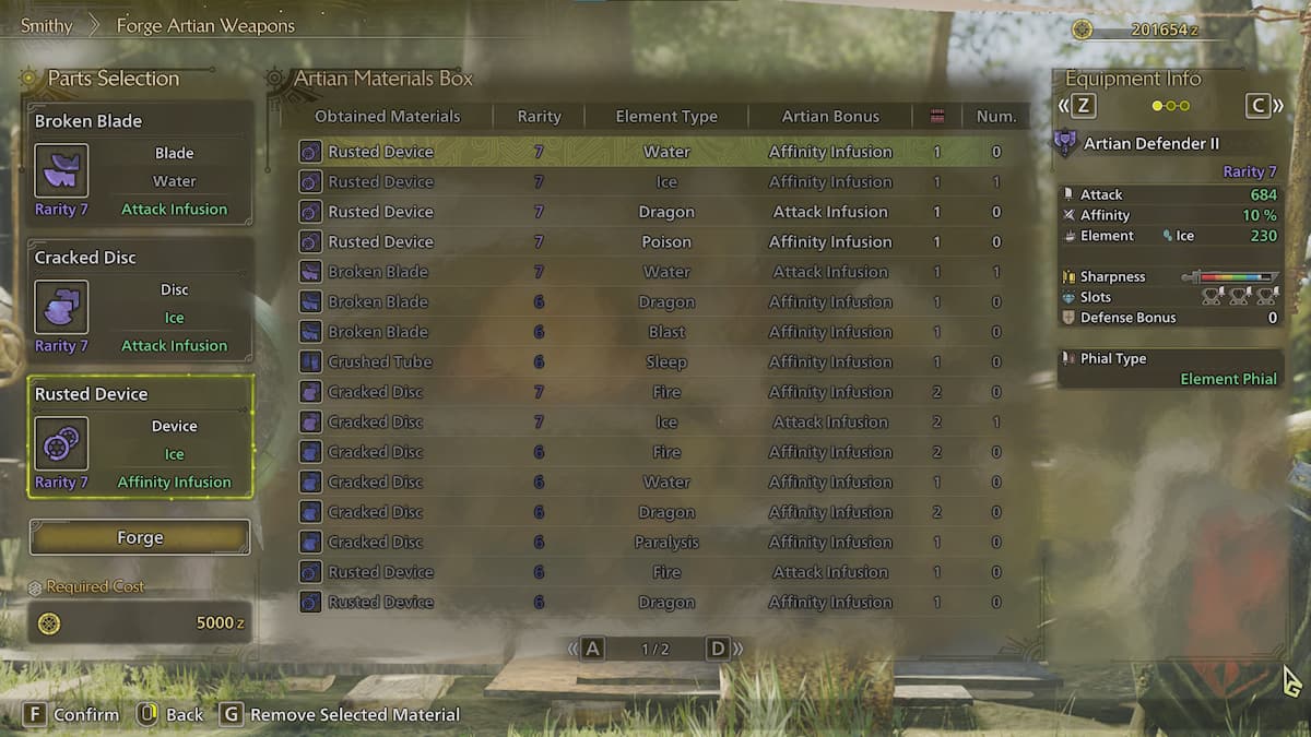 十分なアーティアンの部分があるときは、それらをジェマに連れて行ってください。彼女はそれらをまとめることができます。アーティアンの武器を作成するには、同じ希少性の少なくとも3つの部分が必要です。たとえば、珍しい6つのArtian Charge Bladeを作成したい場合、3つの部分はすべて希少性7である必要があります。それらは同じ要素である必要はありませんが、それは確かにあなたの全体的なダメージ出力に役立ちます。