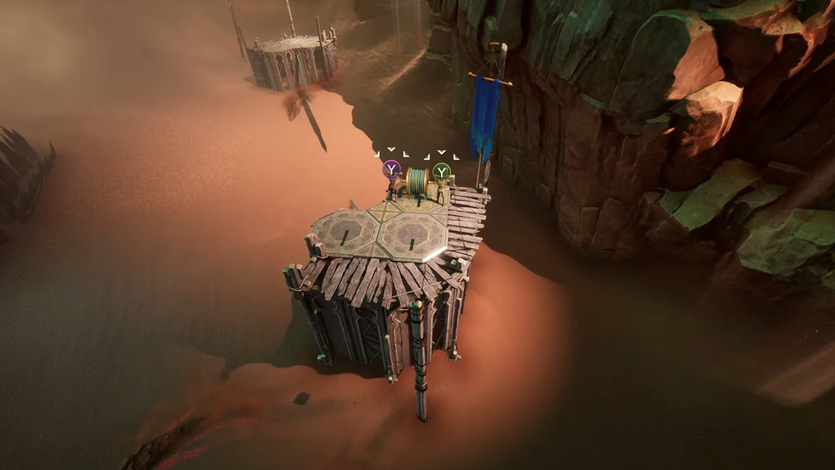開始するには、ZoeまたはMioのいずれかを選択して、タワーの1つと対話します。レバーをアクティブにすると、地面にパルスを送り、サンドフィッシュの注意を引きます。ボタンプロンプトが表示されます。