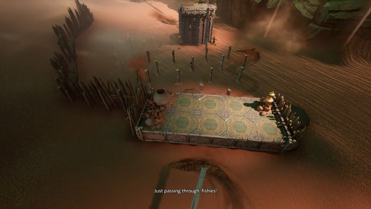 最初のサンドフィッシュを脱出した後、両方のプレイヤーはそれを落下させるためにビームと対話し、交差への道を作り出す必要があります。ただし、注意してください。2番目のサンドフィッシュがビームの下に旋回しているため、タイミングが重要です。