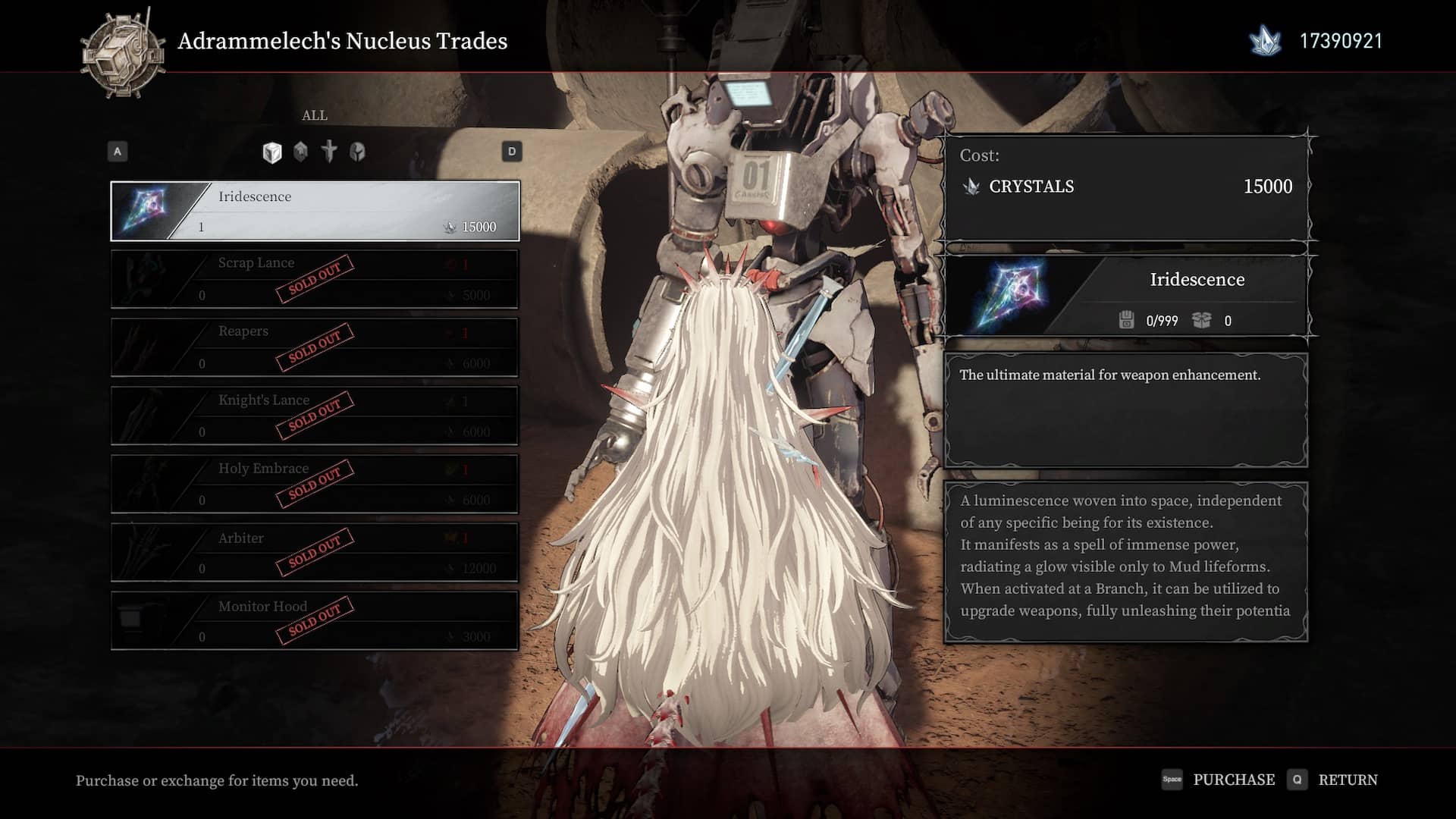 虹色AI制限の究極の武器強化材料です。から1つの虹色を購入できますAdrammelechの核貿易でロボット一時的なキャンプ場15,000のクリスタルの場合(このオプションはゲームの後半で利用可能になります)。そうでなければ、できますマップの周りにいくつかを集めます、具体的にはHagios Patir上位レベル、そしてまたいくつかのエンドゲームのボスはそれをドロップします。