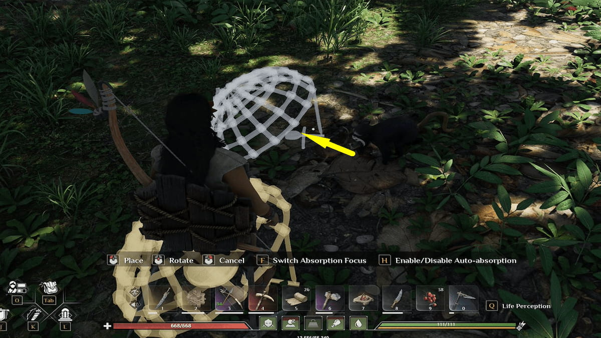 良い場所を見つけたら、ショートカットスロットからトラップを選択して、地面に置くことができます。また、トラップの中に餌を置く必要があります。サルに使用するのに最適な餌はナッツです。特定の木を刻むことでナッツを集めることができます。トラップを保持して在庫を開き、ナットを空のスロットにドラッグします。