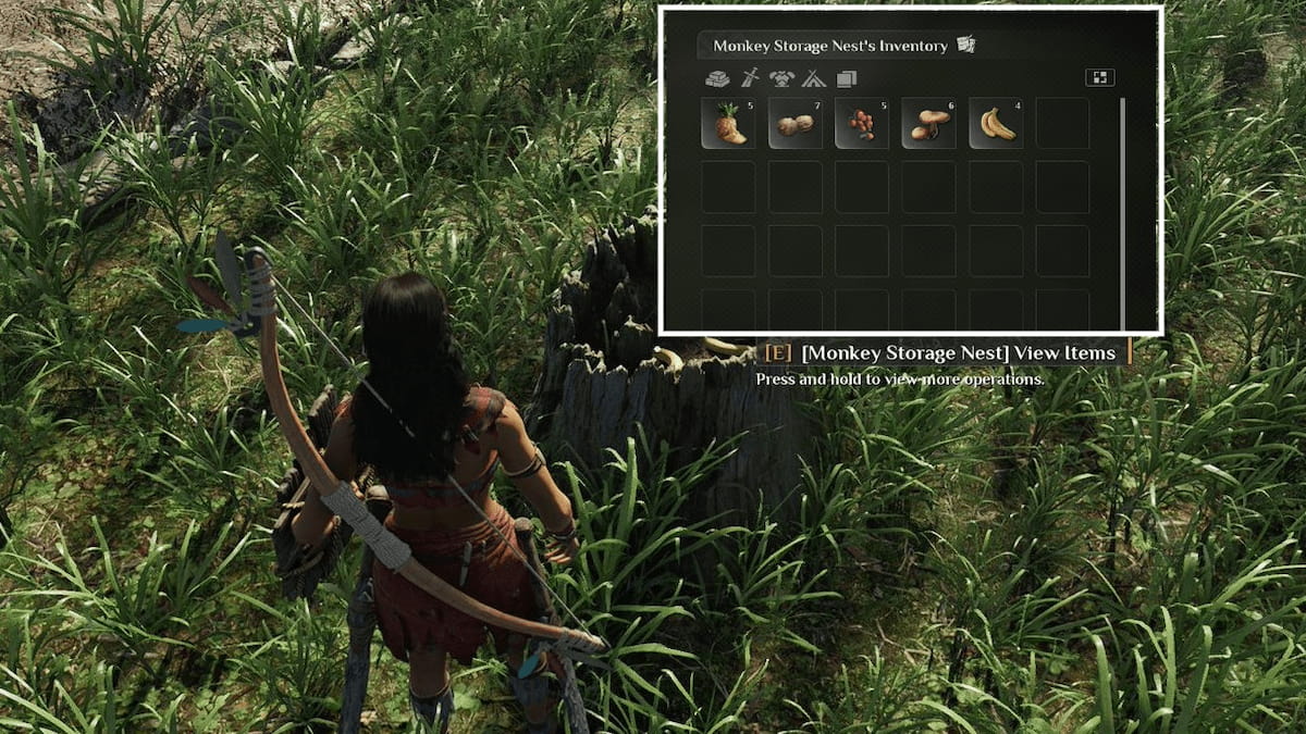 サルがここにアイテムを保管するのに時間がかかる可能性があるので、我慢してください。アイテムを入れていない場合は、巣を別の場所に移動してみてください。または、猿の在庫を直接確認して、それらに何かがあるかどうかを確認できます。あなたが部族の人と同じように、彼らのところまで歩いてEを握って彼らのアイテムを見る。