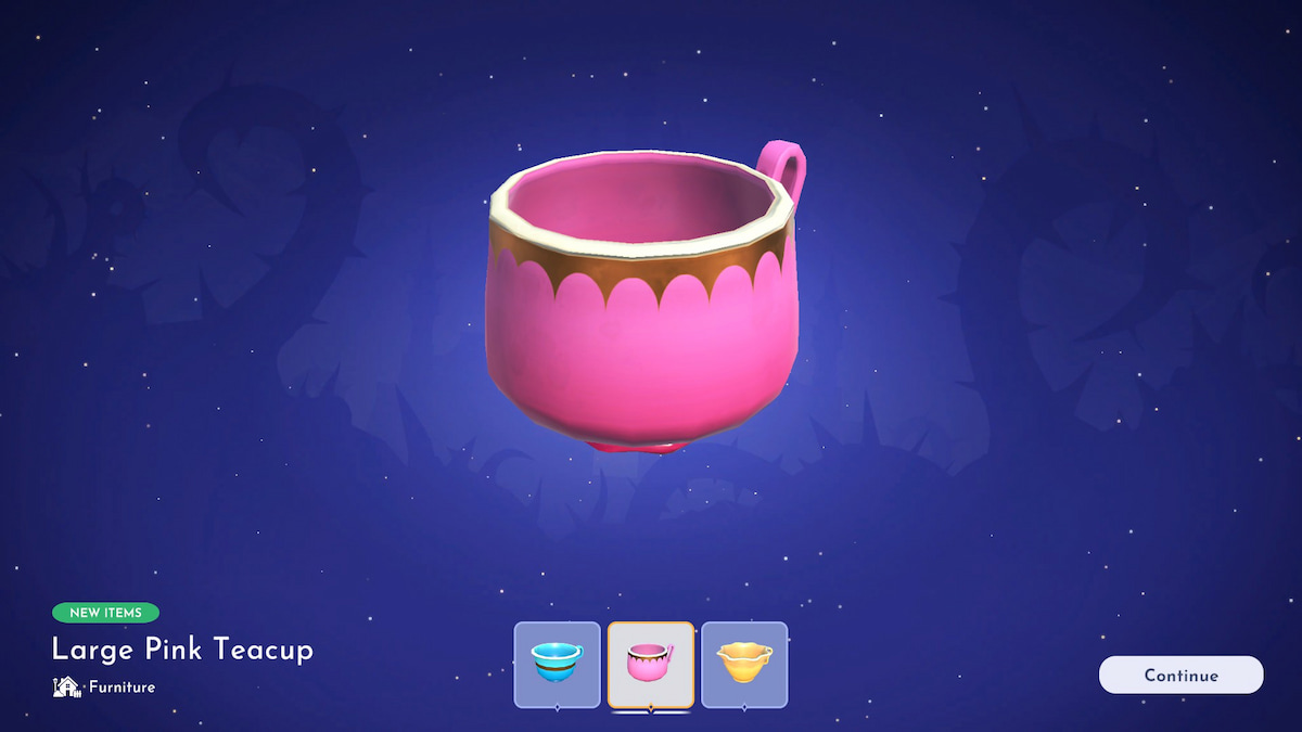 女王のクロケットの庭の中心に戻り、巨大なハートゲートそのバックエンドの近く。このゲートと対話します幻想的なキーを使用しますロックを解除します。内部には、家具ポーチがあります。その後、在庫からこのアイテムを開いて、大きな青いティーカップ、大きなピンクのティーカップ、大きな黄色のティーカップを獲得できます。