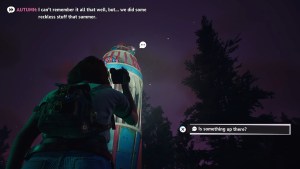 レンガを手に入れたら、ロケットに戻り、Swann's Handycamを使用してキーに光を当てます。秋がステップアップして、鍵にレンガを投げようとします。彼女はそれらをノックダウンしようと3回試みます。彼女が失敗した場合、キャットは引き継ぎます。