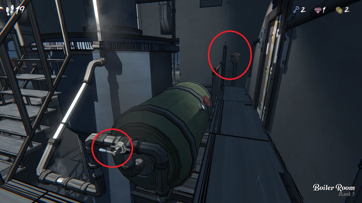 あなたがボイラー室を見つけたとき、あなたの最初のタスクは3つの緑のタンクのバルブ。 1つは簡単にアクセスできますが、他のものはより挑戦的です。