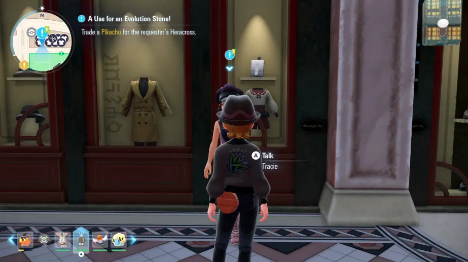 ピカチュウを捕まえたら、クエストを与えたNPCのところに戻ります(彼女の位置は地図上にマークされます)。彼女に獲物をあげれば、努力に応じてヘラクロスを手に入れることができます。これにより、「進化石の使い道」ミッションも完了し、以下のアイテムを獲得できます。