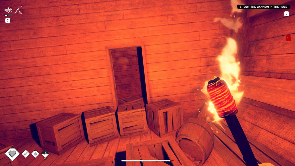 あなたの目標は、大砲を発射し、ブリッグを開くことです。ホールドに火薬とキャノンボールを見つける必要があります。閉まっていないドアは1つだけですが、胸でブロックされています。大砲がある場所に近いところにあります。私は光が出るまで開口部を見ずにこのスペースを何度も見ました。トーチを使用すると、この検索がはるかに簡単になります。