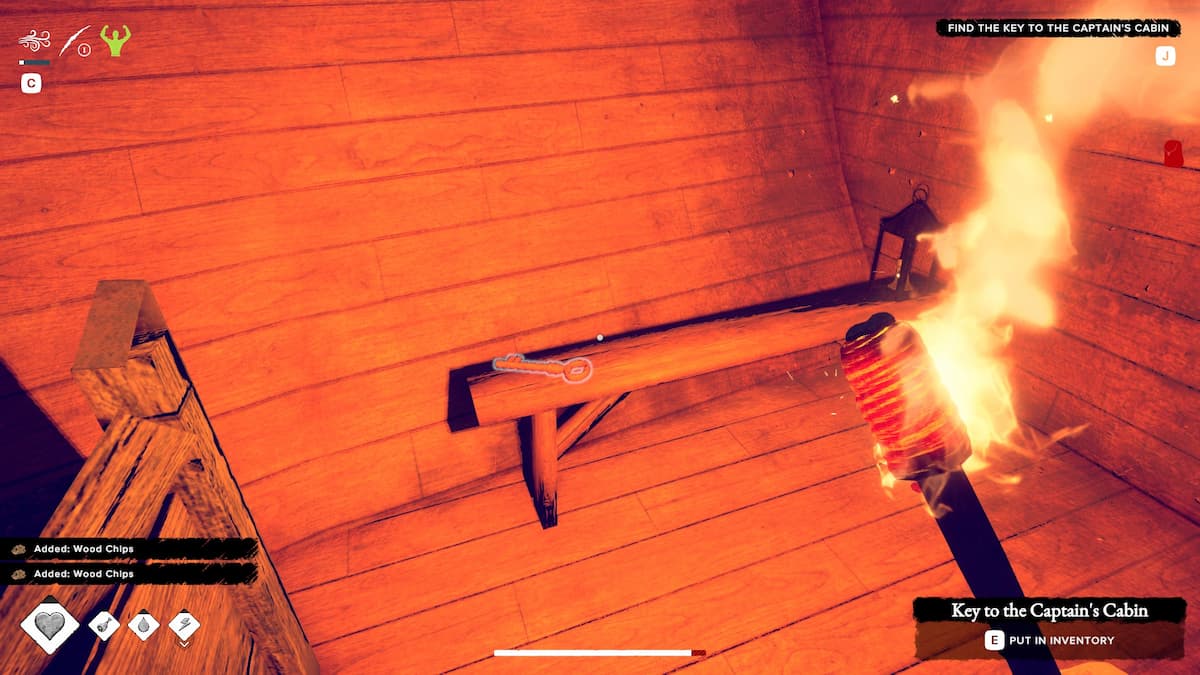 廊下に戻り、右側の部屋に向かいます。キャプテンのキャビンの鍵はベンチにあります。袋のスタックの後ろには、2つのユニットの木製チップがあります。これで、船長の宿舎にアクセスして、サンタマリアに何が起こったのかを学ぶことができます。