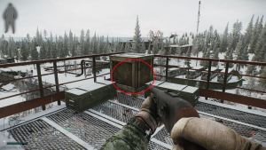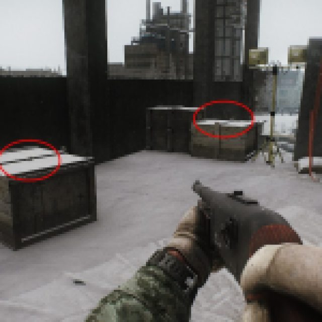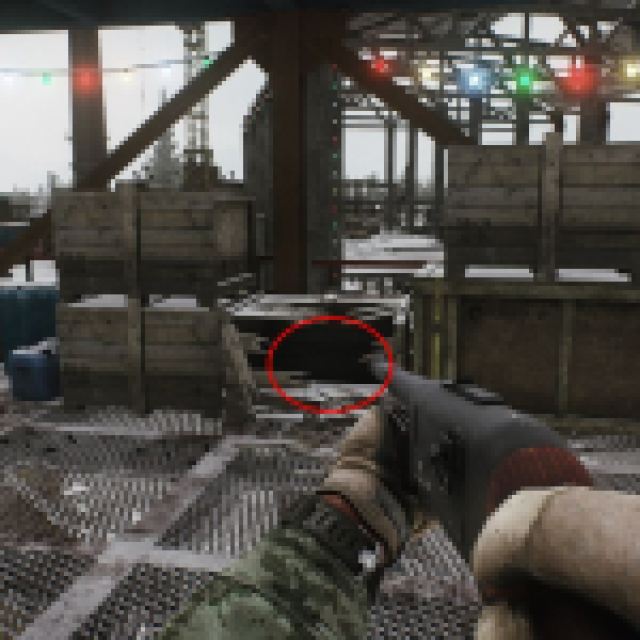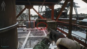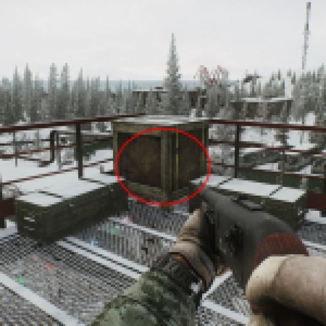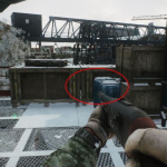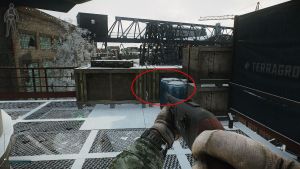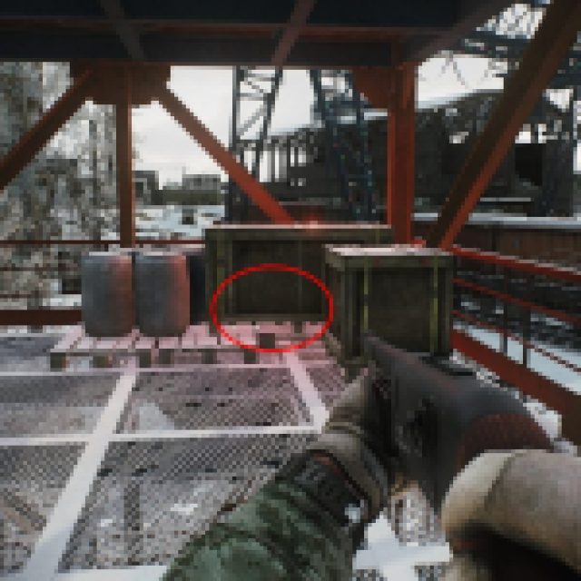 3階に行き、手すりの近くの足場の中央に行きます。壊れた箱が表示され、ここでDVL-10マガジンを隠しています。繰り返しますが、目的を配置するときは、カバーにボックスを使用してください。