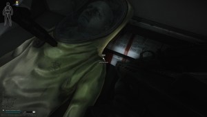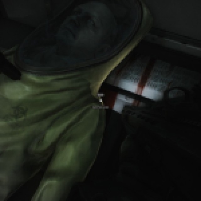 封じ込め室の中に入ったら、すぐにスイッチドアを開けて、実験室に向かいます。廊下の終わりまでに、右を見ると、床に黄色い危険物が死んでいる人が見えます。スーツの右肩を見て、感染した血液サンプルを服用します。