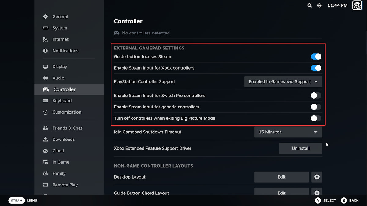 追加の尺度として、さまざまなタイプのコントローラーのサポートを有効にして、コントローラーの種類も考慮します。これを行うには、以下の手順に従ってください。