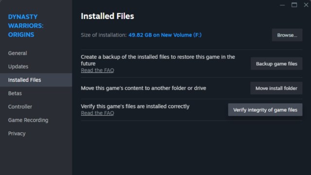 別の問題は、ゲームが誤ってインストールされていることです。 Steamを介したファイルの整合性を確認して、ダウンロードとインストール中に重要な構成ファイルを見逃さないようにすることをお勧めします。これは、SteamのDynasty Warriors Origins Propertiesページを通じて確認できます。