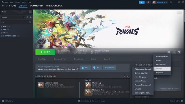 - ライブラリでゲームを右クリックして選択することにより、Steamを介してマーベルのライバルをアンインストールします。管理、"それから "アンインストール。」