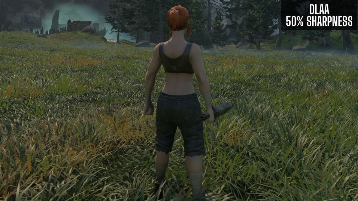 ご覧のとおり、右の画像の葉はより鮮明で鮮明ですが、左スクリーンショットではぼやけて解決されていません。 TAAイメージは一般に固定位置で解決するため、これは動きがより顕著です。草以外、木、衣服、キャラクターの髪は、スライダーが50%に設定された顕著な改善の死んだ景品です。