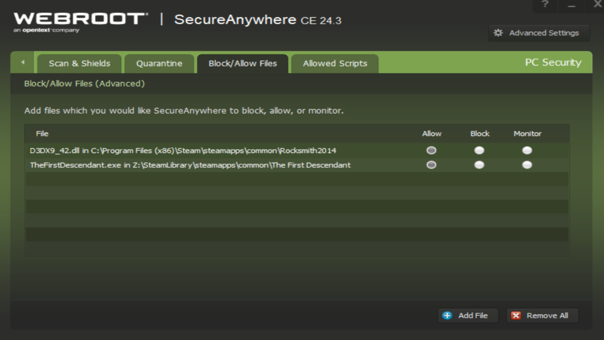 Webroot、Bitdefender、McAfee、またはNortonなどのAntivirusソフトウェアを使用する場合、最初の子孫のファイルの1つにウイルスとしてフラグを立てたかどうかを確認する必要があります。ソフトウェアの検疫セクションに入ることで、そうすることができます。その後、First DescendantのフォルダーとFirstDescendant.exe実行可能ファイルをプログラムのホワイトリストに追加して、将来の問題を防ぎ、最初の子孫のst音の問題を停止します。