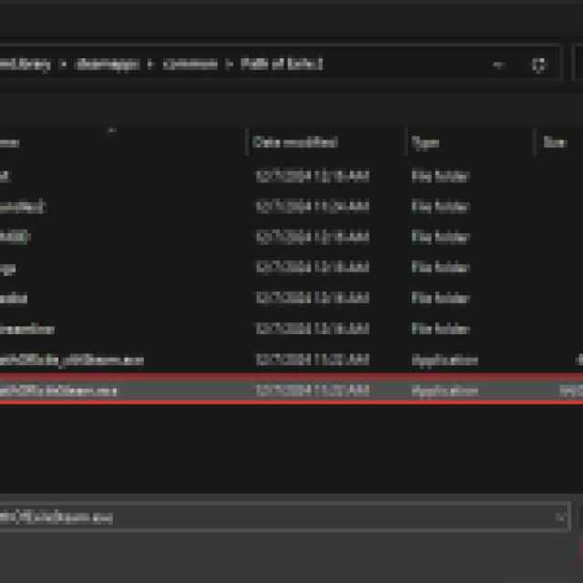 - 亡命2のパスが設置されている場所に向かい、pathofexilesteam.exeサイズが約65 MBの実行可能ファイル。