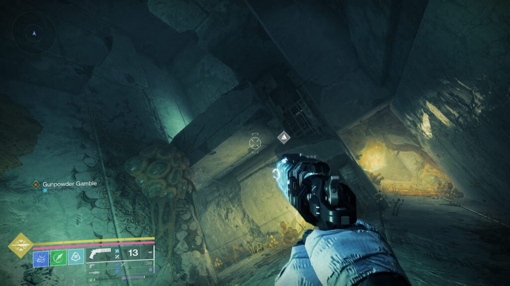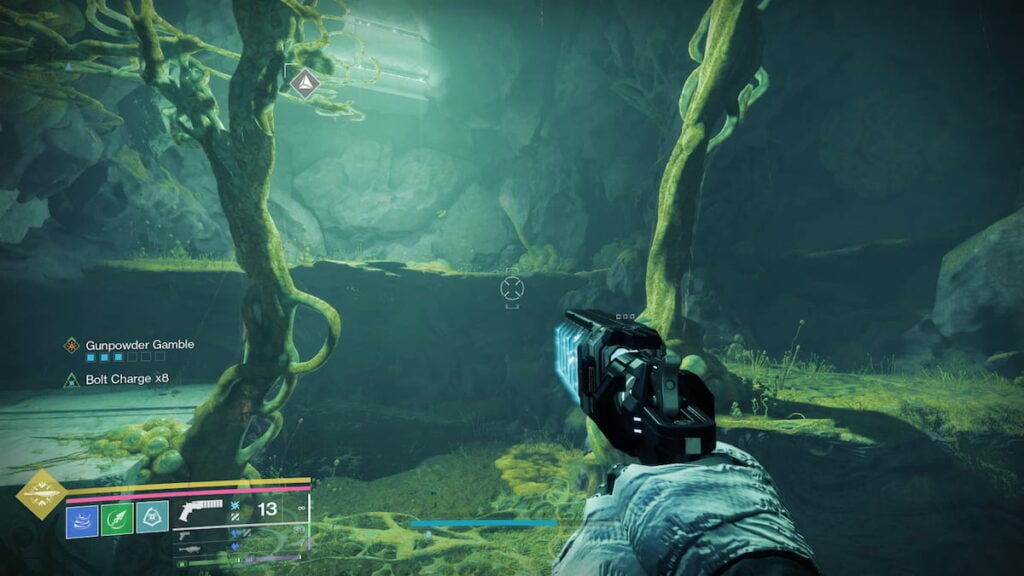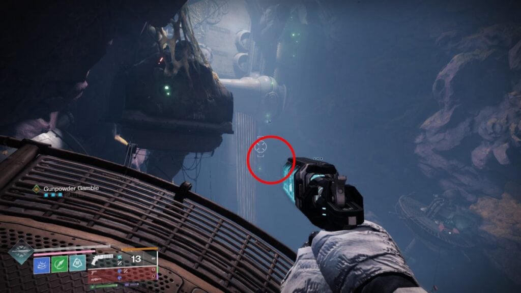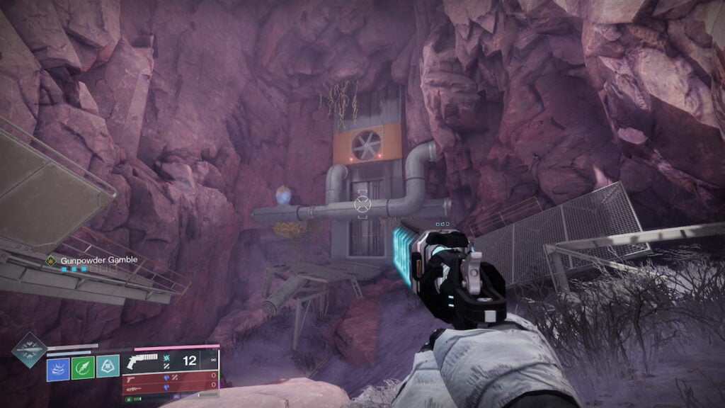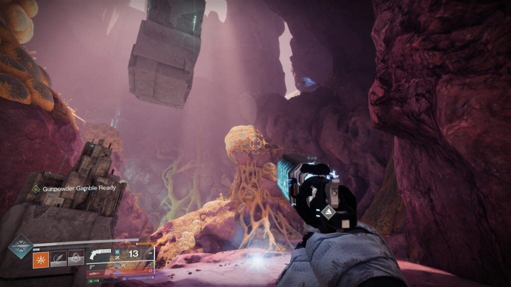 真ん中のVEX構造(これにはポータルがあります)を登り、左側の構造に飛び乗って再開をつかみます。リュセーターをポータルに持ってきて、花を撃ち、洞窟の中の洞窟の中にある花を撃ちます。最も遠いターゲットを撃ち、ポータルを使用して最終的な触媒部分に到達します。