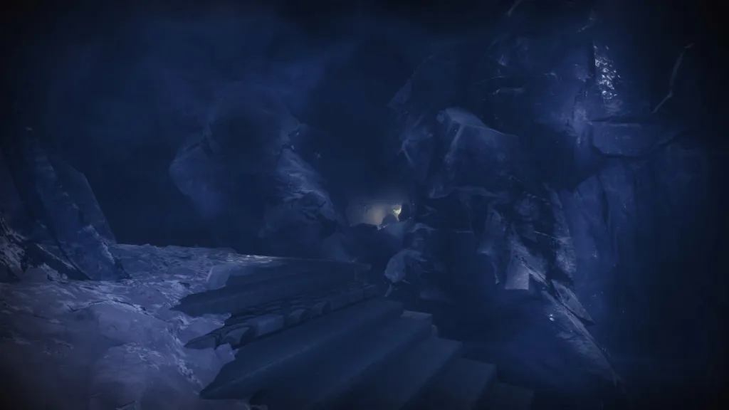 最初の奇妙な場所から、下の氷の棚に落ちます。倒れた柱の下にしゃがんでミッションを続けるのではなく、氷の階段が見えるまで少し後戻りしてください。右を見ると、シンボルの付いたドアが見えます。それを溶かしてから中に入り、Blight を見てください。後ろの小さな棚に登り、しゃがんで壁の穴を通り抜け、右側の道を進んでブライトを破壊します。近くの溶ける壁を通って外に出ます。