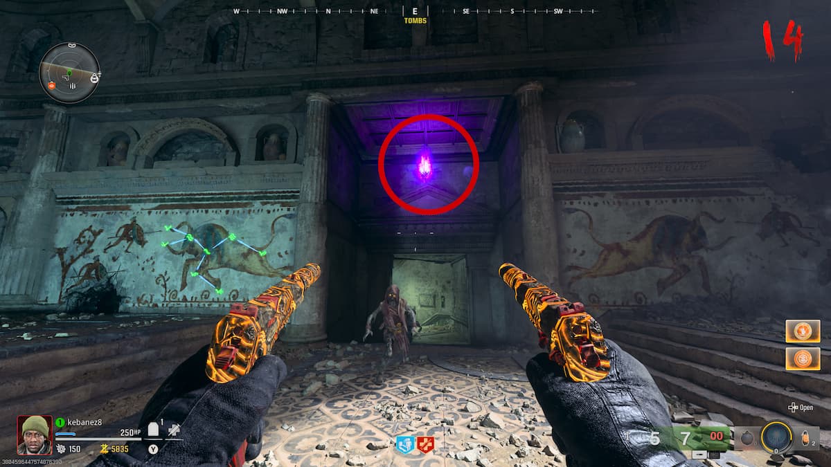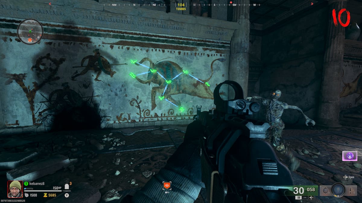 ローマの数字を順番に撃ちます星座を形成するまで。光の閃光が現れ、アンデッドとエリートのゾンビとの戦いを強要します。マスタングとサリービルド(または任意の優先武器)とパークコラスでこの対決を乗り切るために最善を尽くしてください。十分なゾンビを倒した後、白い光が再び現れ、絵画の近くのヘッドピースまたはスタッフのいずれかを拾うことができます。