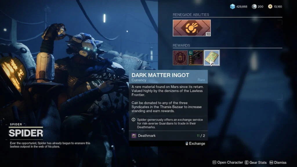 Invasion をプレイしたくない場合は、スパイダーでデスマークをダークマターインゴットと交換するタルシス前哨基地にて。ただし、スパイダーは 2 つのデスマークにつき 1 つのダークマター インゴットしか提供しないため、たとえ侵略が失敗したとしても、より多くの報酬を獲得できる可能性があります。