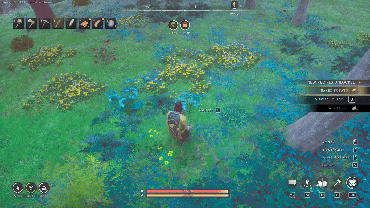 灰の丸太と石は簡単に見つけることができます。それらを草から拾うか、木を切り倒して、リソースを獲得するためにボルダーを採掘できます。亜麻に関しては、テンプルウッズの東にあるBramblemead Valleyに行くことで、そのリソースを簡単に略奪できます。ここで賢い老人を訪問し、チュートリアルの一部としてエリアに基地を設置する必要があります。