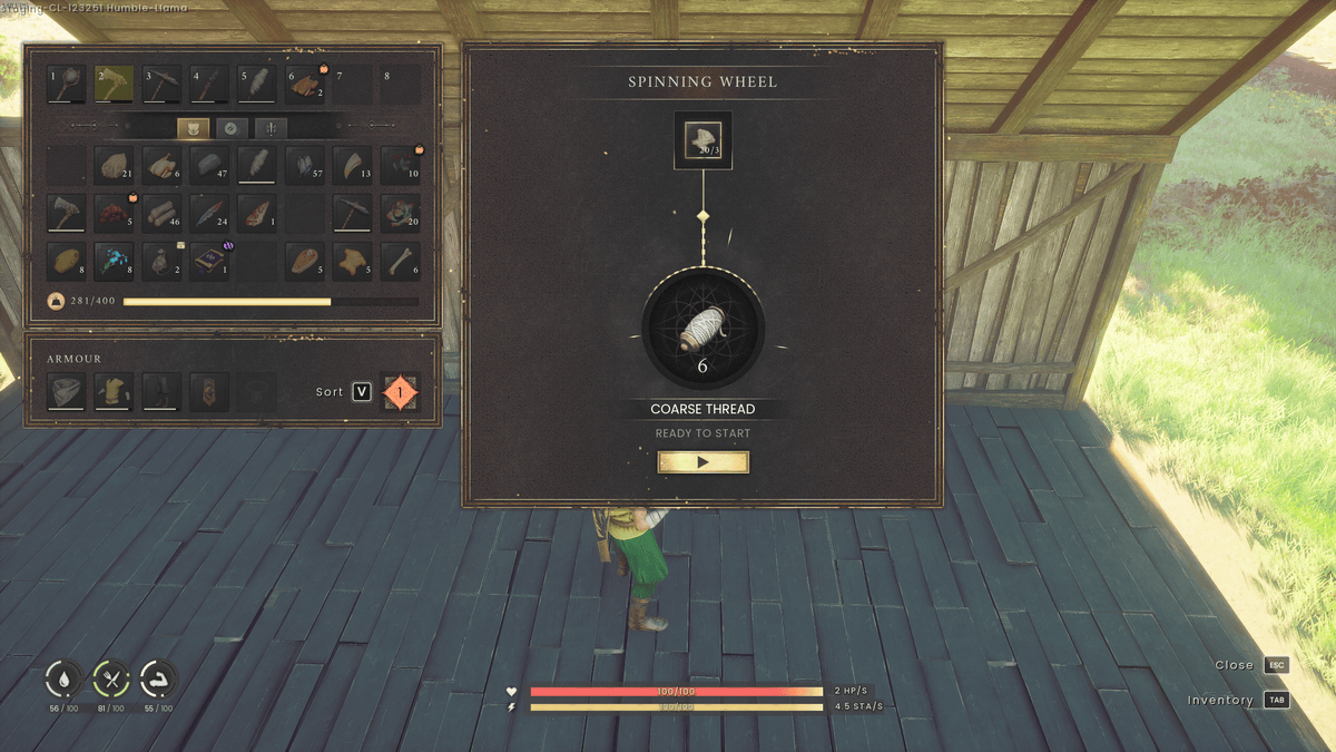 その上に屋根が付いた回転ホイールが構築されたら、それに近づいてインタラクションボタンを押します。ここでは、上部の正方形に粗い動物の毛皮を挿入してから、「クラフト」を押して粗い糸の生成を開始できます。粗い糸を作るのに3つの粗い動物の毛皮が必要なので、弓のような他のクラフトレシピに十分な糸を作るのにかなりの量の毛皮が必要です。
