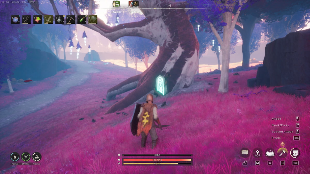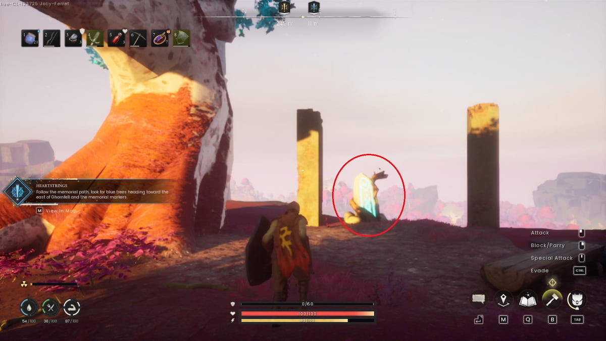 クエストの出発点から下り坂を歩くと、小さな丘に腰掛けた敵の要塞の横に印象的な青い木を見つけます。近くの石の構造に近づき、それと対話して、ユニークなオーディオの驚きを明らかにします。