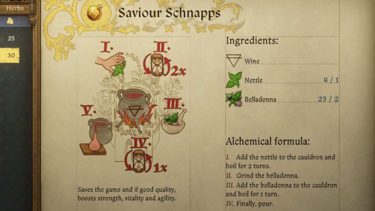KCD2でイラクサとベラドンナを使用して救い主シュナップスを作る方法