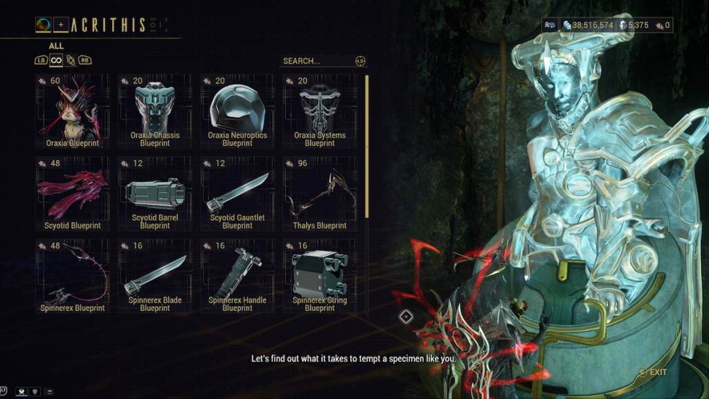 Oraxiaの主要な青写真には60の断念殻と、それぞれの部分に20が必要です。農業中にロックを解除しない場合、合計120の合計があります。このショップでは、ScyoTid、Spinnerex、およびThalysの青写真と部品も利用できます。通常のランごとに16〜20個のscuttlerの殻を取得しますが、スチールパスバージョンは最大22〜24になります。