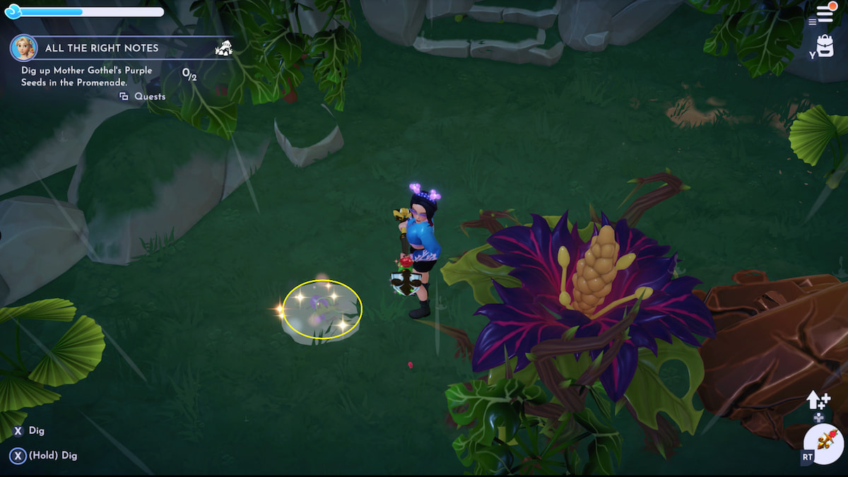 まず、特別な紫色の花が必要です。に向かいますプロムナード、野生のもつれのすぐそばにあり、2つの輝きを探しますゴールドディグスポット。シャベルを使用して2つのスポットを掘り下げて紫色の種。次に、それらを植えて水をやります。あなたがそれらを収穫する前に彼らが成長するまで20分かかります。