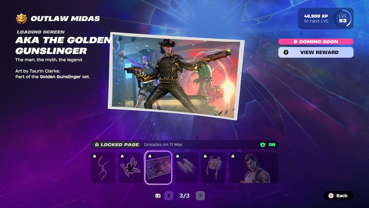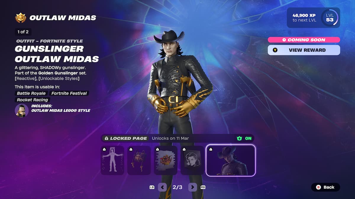 Outlaw Midasには、第6章、シーズン2のバトルパスに3ページの報酬があり、すべての報酬を請求するために合計32レベルが必要になります。