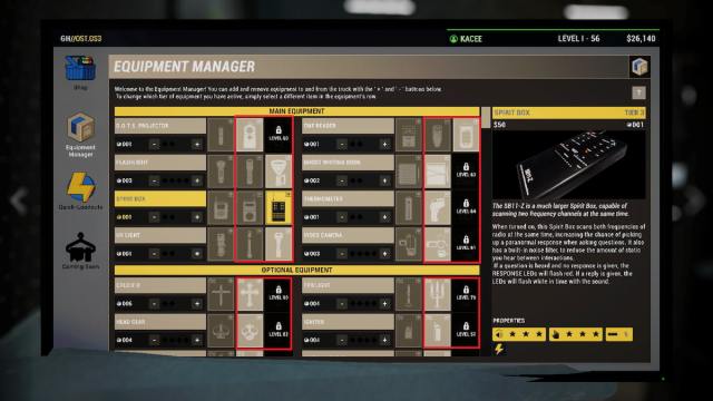 | スピリットボックス | レベル1でロック解除されたデフォルトのアイテム。 | レベル27でロックを解除し、アップグレードに3,000ドルかかります。 | レベル54でロックを解除し、アップグレードに3,000ドルかかります。 |